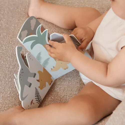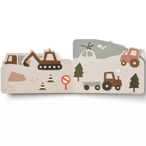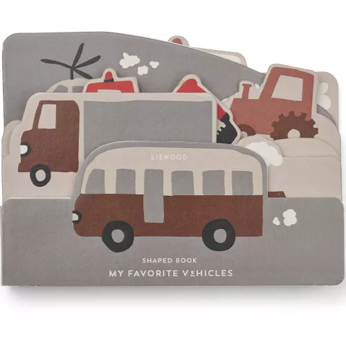 Een mooi geïllustreerd en interactief kartonboekje ‘Jade Special Shape Book – Vehicles / Dove Blue’ van het Deense merk Liewood.