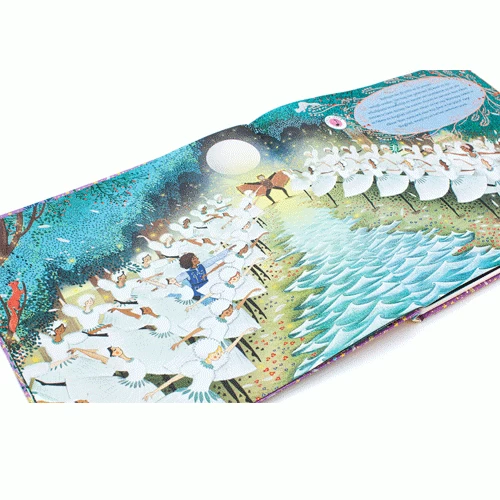 Er zit muziek in dit boek. Op elke bladzijde kun je op een noot drukken, waardoor het verhaal tot leven komt met muziek van Tsjaikovski’s Het Zwanenmeer.