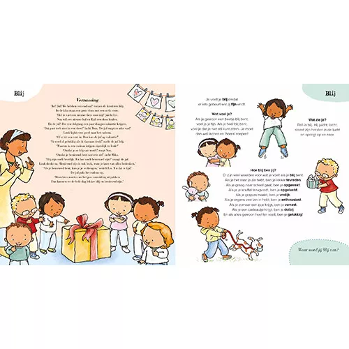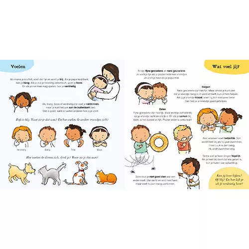 Wat voel jij? Voelt een ander dat ook? En welke woorden zijn er voor wat je allemaal kunt voelen? Het is fijn als je een ander kunt helpen en als je kunt vertellen waarom je bang, boos of blij bent!