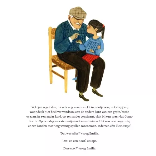 Als Emilia op een ochtend een walnoot vindt, vertelt opa haar het verhaal erachter: dat van zijn reis over de oceaan op weg naar een nieuwe woonplek, met enkel een klein tasje en in zijn jaszak een noot.