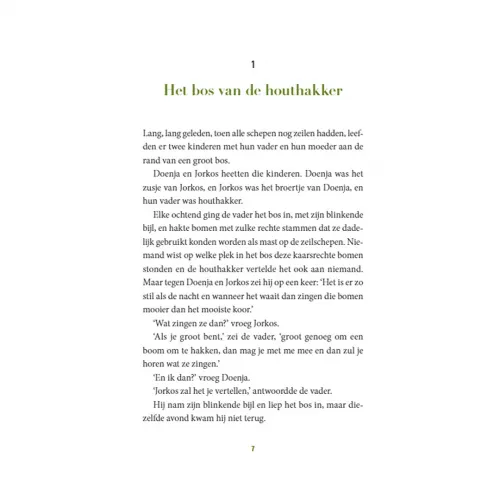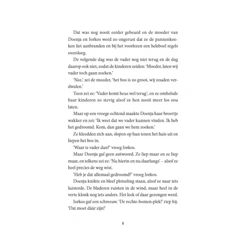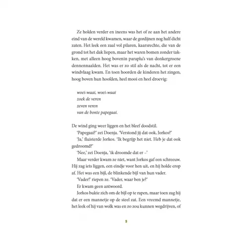 De vader van Doenja en Jorkos is houthakker. Elke dag gaat hij met zijn blinkende bijl het bos in, maar op een avond komt hij niet terug. Als Doenja een droom krijgt die haar vertelt waar ze haar vader kan vinden, besluit ze hem te gaan zoeken. Samen met Jorkos sluipt ze het huis uit en daarmee begint een spannende, geheimzinnige tocht waarin zeven veren van een bonte papegaai een belangrijke rol spelen.