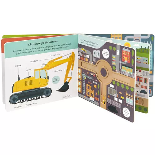 In het dikke kartonboek ‘Een rondje over de bouwplaats’ van Johnny Dyrander maken peuters eerst kennis met een groot voertuig dat gebruikt wordt in de bouw. Daarna kunnen ze het zelf een rondje laten rijden! Met hun vinger kunnen ze de bulldozer, graafmachine, kiepwagen en shovel over de hele bouwplaats sturen.
