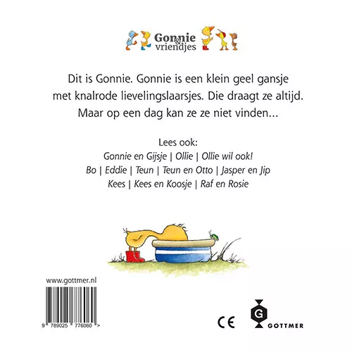 Dit is Gonnie. Gonnie is een klein, geel gansje met knalrode lievelingslaarsjes. Die draagt ze altijd. Maar op een dag kan ze ze niet vinden… ‘Gonnie’ van Olivier Dunrea is een grappig peuterboekje met verhaaltjes die heel dicht bij de beleving van peuters staan.