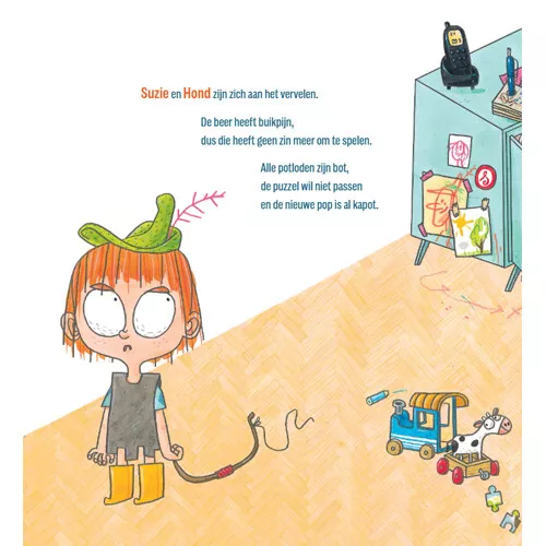 Suzie Ruzie is een eigenzinnig meisje met eindeloos veel energie en fantasie. Net als elke peuter maakt ze elke dag weer van alles mee. Zo vindt ze in een la een schaartje, of eigenlijk vindt het schaartje haar. En voor je het weet gaat zo’n schaartje een eigen leven leiden en knipt het er lustig op los. Alles en iedereen, binnens- én buitenshuis, moet eraan geloven – zelfs haar trouwe vriend Hond.