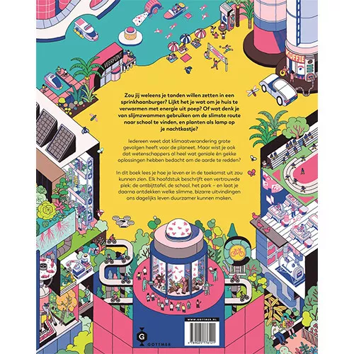 In dit kleurrijke non-fictieboek leren kinderen hoe uitvindingen en wetenschap de klimaatverandering kunnen aanpakken en hoe we duurzamer kunnen gaan leven. Een insectenburger als snack, slijmzwammen als routepijlen, planten als lamp op het nachtkastje… Wat deze dingen gemeen hebben? Allemaal zijn het groene antwoorden op grote en alledaagse klimaatvragen. Van de ontbijttafel tot op school, in het park en op de boerderij, deze bizarre en geniale uitvindingen passen zo in het dagelijkse leven – ook al lijkt dat misschien onvoorstelbaar.