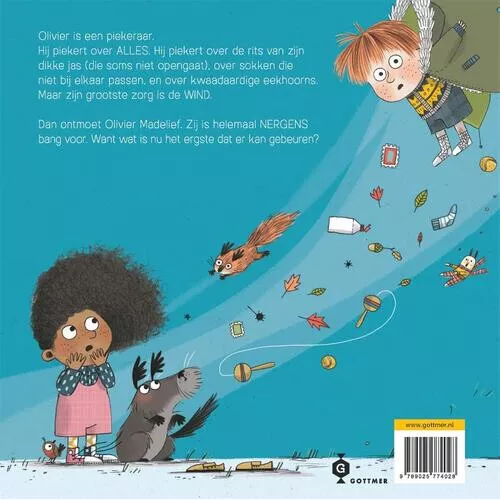 Maar het meest maakt hij zich zorgen over de wind. Die is pas echt eng. Dan ontmoet hij Madelief. Zij is helemaal nergens bang voor. Olivier moet haar beschermen! Hij laat haar zien hoe je te knapperige koekjes veilig kunt eten en hoe je schoenetende wormen vermijdt. Maar dan wil Madelief buiten spelen als het heel, heel hard waait… Is de wind echt zo eng, of is die misschien ook best een beetje leuk?