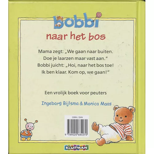 In dit vrolijke peuterboekje ‘Bobbi naar het bos’ van Ingeborg Bijlsma en Monica Maas maakt beertje Bobbi zich klaar om naar het bos te gaan. De lieve verhaaltjes uit de populaire serie prentenboeken over Bobbi zijn op rijm geschreven.