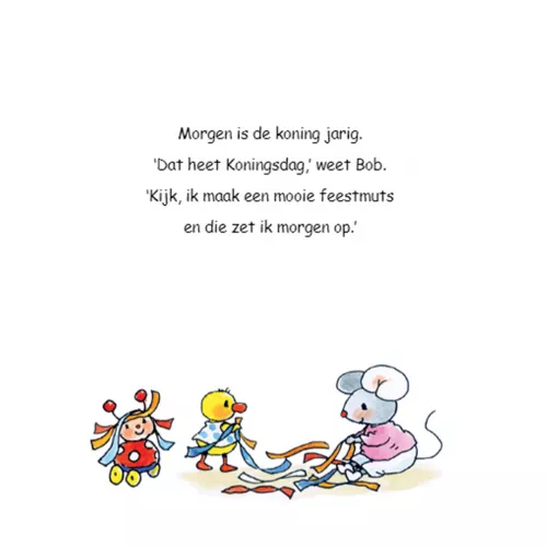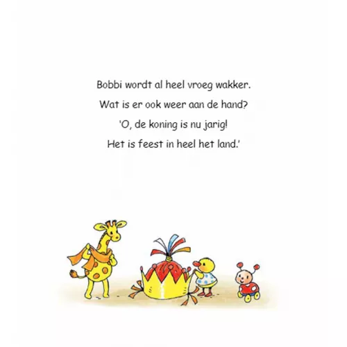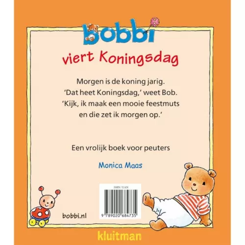 In het peuterboekje ‘Bobbi viert Koningsdag’ van Monica Maas brengt Bobbi een bezoekje aan de vrijmarkt en doet hij mee aan de kinderspelen. Hoera voor de koning!