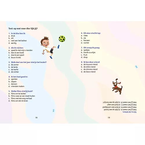 Naast een aantal leuke verhalen, staat het bomvol puzzels, raadsels, dilemma’s, woordspelletjes en invulopdrachten. Je kunt ook je kennis testen over bijvoorbeeld voetbal of erachter komen op welk dier jij nou het meeste lijkt.