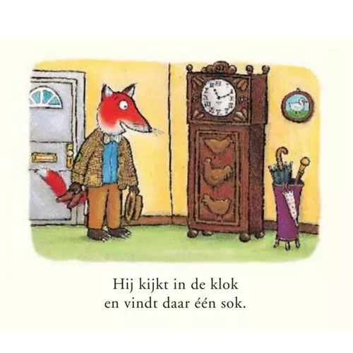 In het kartonnen flapjesboek ‘Vos zoekt zijn sokken’ van het Gruffaloduo Donaldson en Scheffler gaat vos op zoek naar zijn verdwenen sokken.