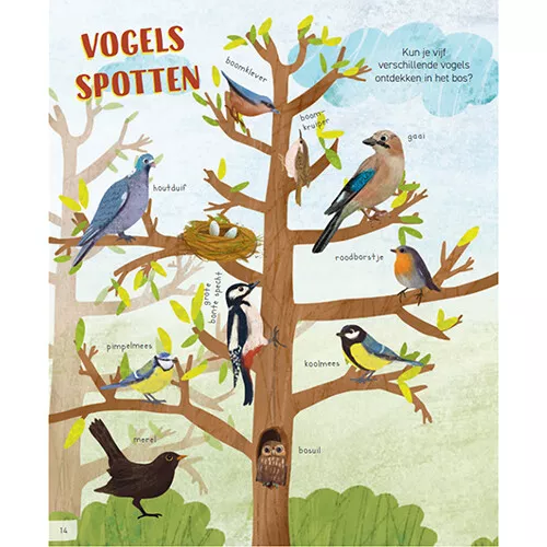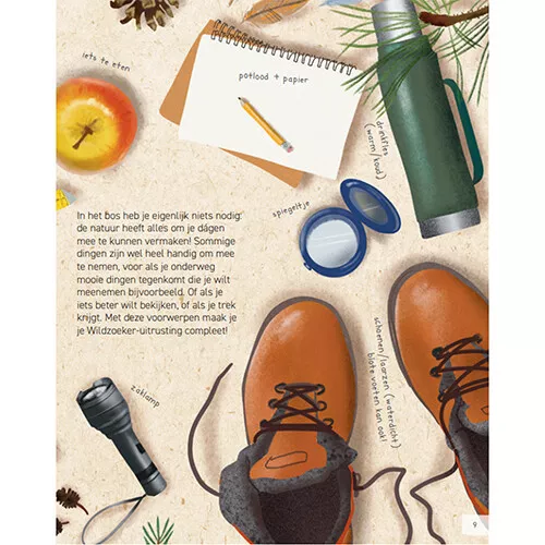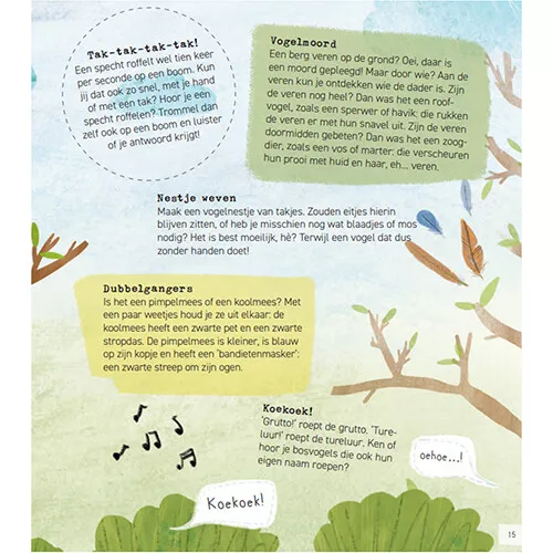 Leer vogels, planten en dieren herkennen en leef je uit met de meer dan honderdzestig activiteiten in het boek waarbij je steeds meer over het bos ontdekt. Van het maken van katapulten, je richting bepalen aan de hand van de zon en het zoeken naar zaden tot racen met echte slakken, regenwormen voelen en bomen nadoen.
