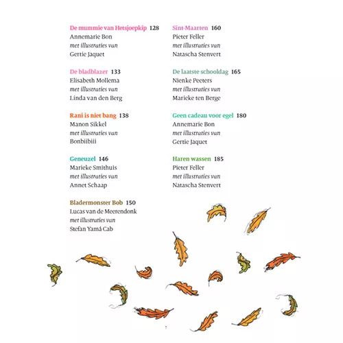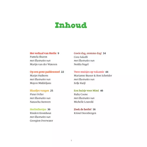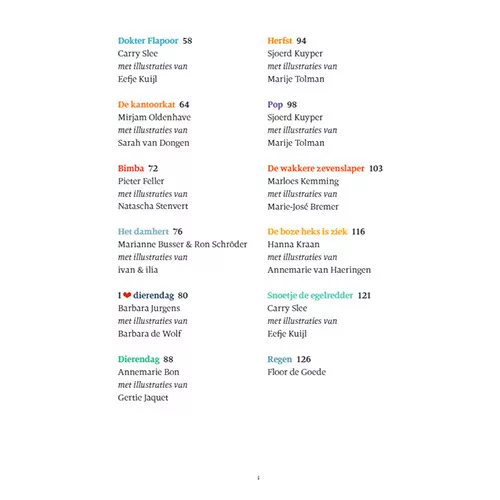 Met verhalen van Annemarie Bon, Marianne Busser & Ron Schröder, Ruby Coene, Pieter Feller, Marjet Huiberts, Barbara Jurgens, Marloes Kemming, Hanna Kraan, Rindert Kromhout, Sjoerd Kuyper, Lucas van de Meerendonk, Elisabeth Mollema, Mirjam Oldenhave, Nienke Peeters, Cora Sakalli, Pamela Sharon, Manon Sikkel, Carry Slee en Marieke Smithuis.