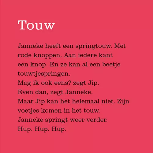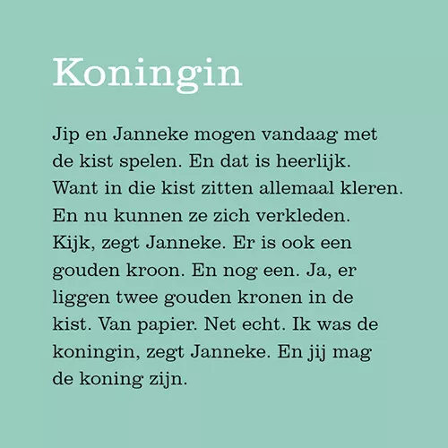 Kijk, dit is Janneke. Ze heeft een springtouw om mee te spelen. En ze bakt helemaal zelf flensjes, voor haar en Jip. Als ze in een kist verkleedkleren vindt, en een kroon, weet ze meteen wat ze wil: Janneke wordt koningin!