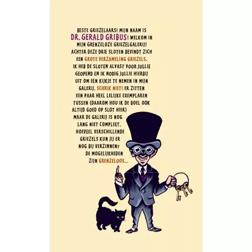 Dr. Gerald Gribus is al vele jaren een groot kenner van monsters en griezels van over de hele wereld (en daarbuiten!). In grappige doeboek ‘Dr. Gerald Gribus’ grenzeloze griezelgalerij’ van uitgeverij Rubinstein heeft hij, samen met tekenaar Erik Kriek, een boek samengesteld waarin hij je laat kennismaken met een grote hoeveelheid griezels en andere enge wezens die hij in zijn lange loopbaan heeft bestudeerd.