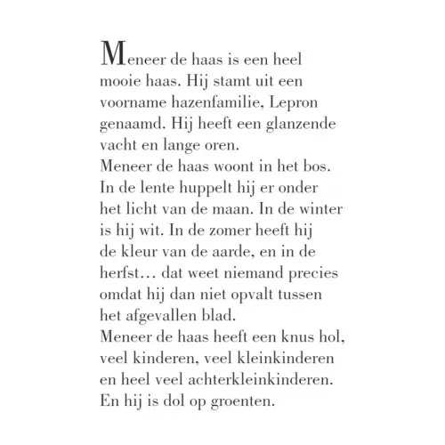 Meneer de Haas heeft een glanzende vacht en lange oren. Hij stamt af van een voorname Italiaanse hazenfamilie, Lepron genaamd. Hij heeft een knus hol, veel kinderen, veel kleinkinderen, héél veel achterkleinkinderen. Bovenal is hij dol op groente. Meneer de Haas maakt van al die groente de lekkerste soep van de hele wereld. Geen enkel dier in het bos weet wat het geheim is van zijn verrukkelijke soep. Op een dag opent Meneer de Haas een fabriek waar zijn beroemde soep dag en nacht wordt bereid, ingeblikt en over de hele wereld verstuurd. Al snel eet iedereen de heerlijke Lepron-soepen, maar dan beginnen de problemen…
