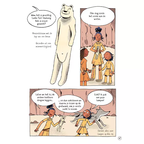 Dit grappige stripboek ’24 uur in de steentijd’ van Lan Cook en Laurent Kling vertelt over een dag in het leven van een jonge holbewoner uit het stenen tijdperk. Ze jaagt, maakt gereedschap en tekent op een rotswand.