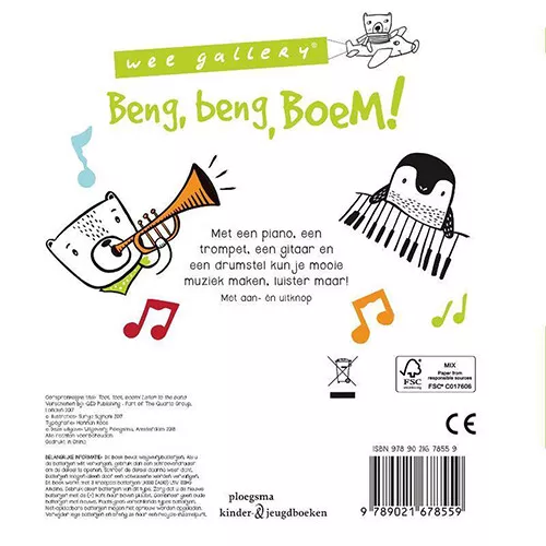 In het kartonnen geluidenboek ‘Beng, beng, boem!’ van het merk Wee Gallery hoor je de prachtige geluiden van verschillende muziekinstrumenten. Druk op de knoppen aan de rechterzijde en luister samen met je peuter naar hoe ze klinken.